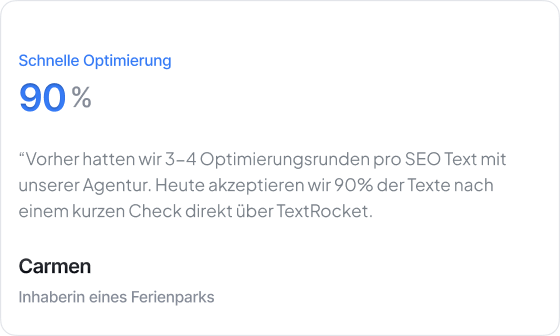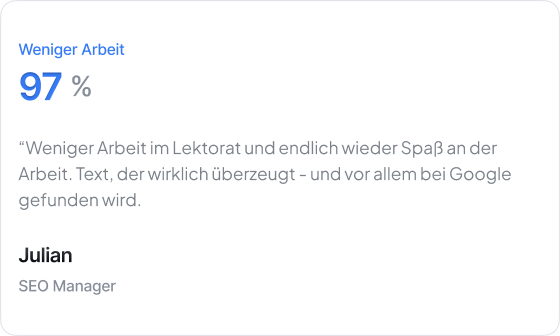 Unsere Texte sind auf menschlichem Niveau geschrieben und gleichzeitig konsequent SEO-optimiert. Wie viel Feinschliff du einplanst, hängt von deinen Ansprüchen oder denen deiner Kunden ab. Ein juristischer Fachtext braucht naturgemäß mehr Lektorat als ein informativer Ratgeber. Aus unserer Agenturerfahrung mit über 2.500+ erstellten Artikeln mit TextRocket können wir sagen: Die Inhalte sind in der Regel nahezu publish-ready. Ein abschließender Qualitätscheck durch dich oder dein Team ist dennoch immer empfehlenswert.